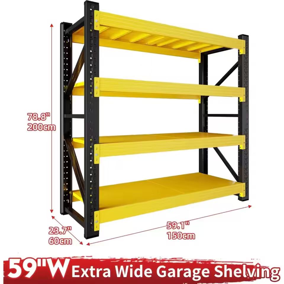 · Extra-large Size Garage Shelving: Our garage shelving are 59"W x 24"D x 78"H in size. The extra-large size garage shelving units offer more storage space and are very suitable for placement in garages, basements, warehouses, etc. Heavy duty garage shelving can also be used as industrial shelves or commercial shelves in workshops, supermarkets, etc., to store heavy items.