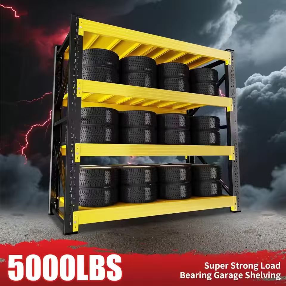 · 5000 LBS Heavy Duty Garage Shelving: Our garage shelving are made of all-metal and feature a triangular mechanical design at both ends to enhance stability. The garage shelves are connected by screws and lock pins. There are multiple reinforcing ribs on the back of the metal shelving, which greatly enhance the load-bearing capacity. The total load capacity of the garage shelf unit is 5,000 pounds. It is very suitable for storing heavy objects such as tires, generators, and oil tanks.