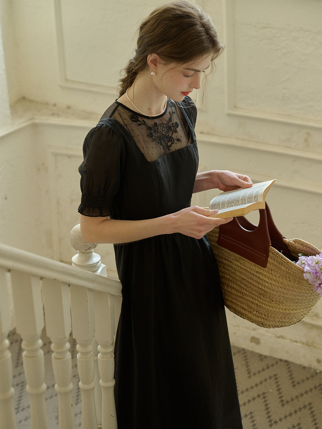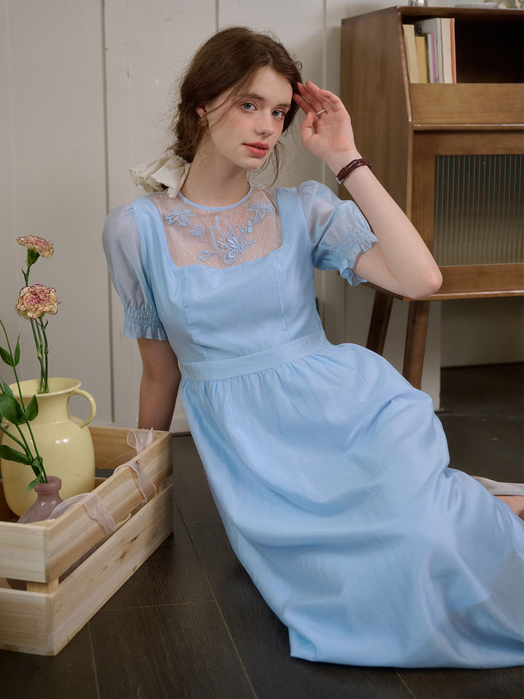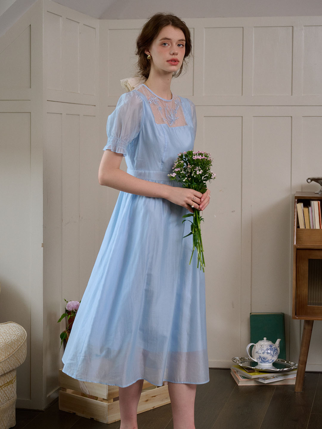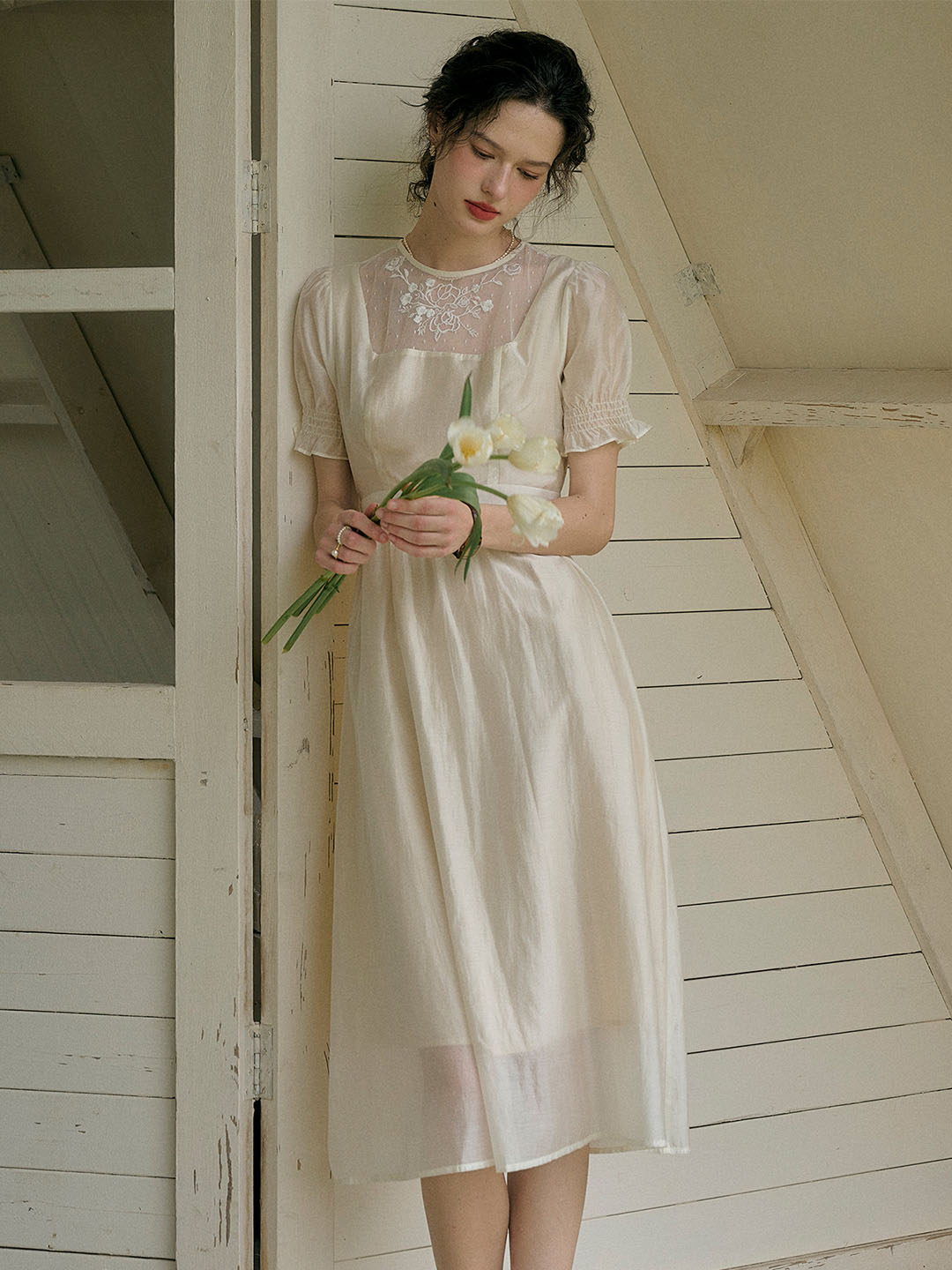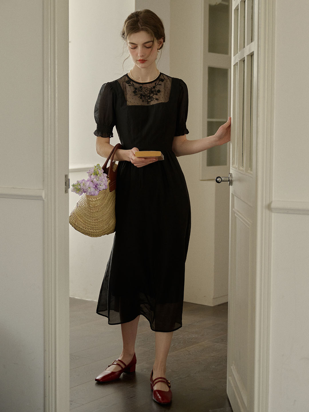 Ariella Round Neck Mesh Embroidered Puff Sleeve Dress