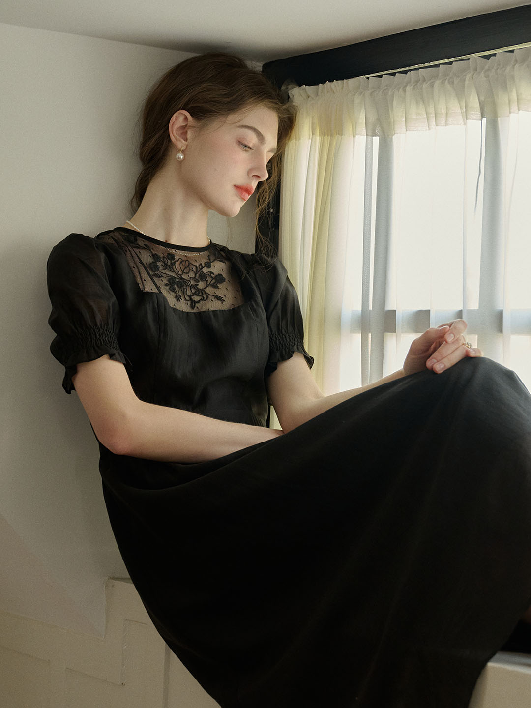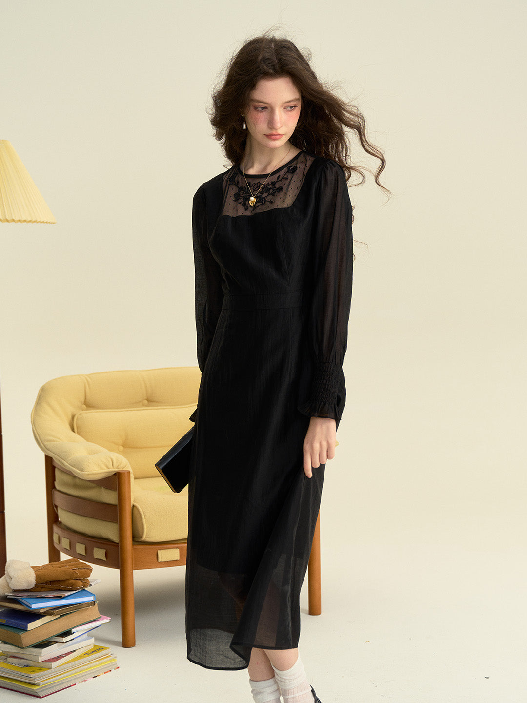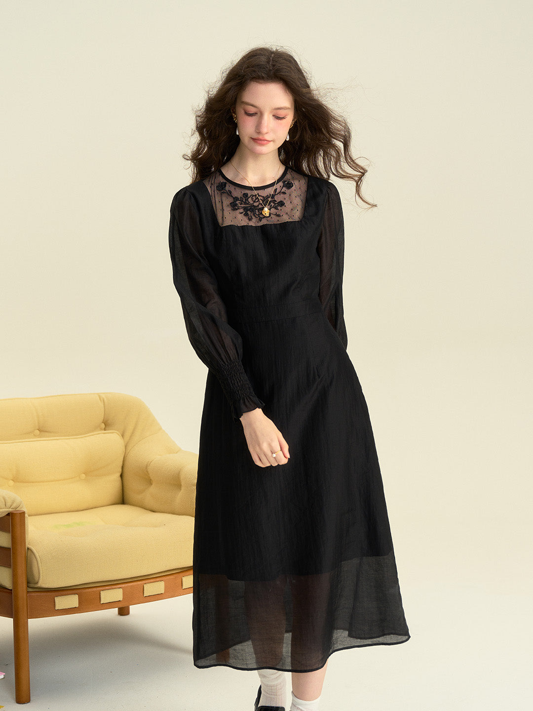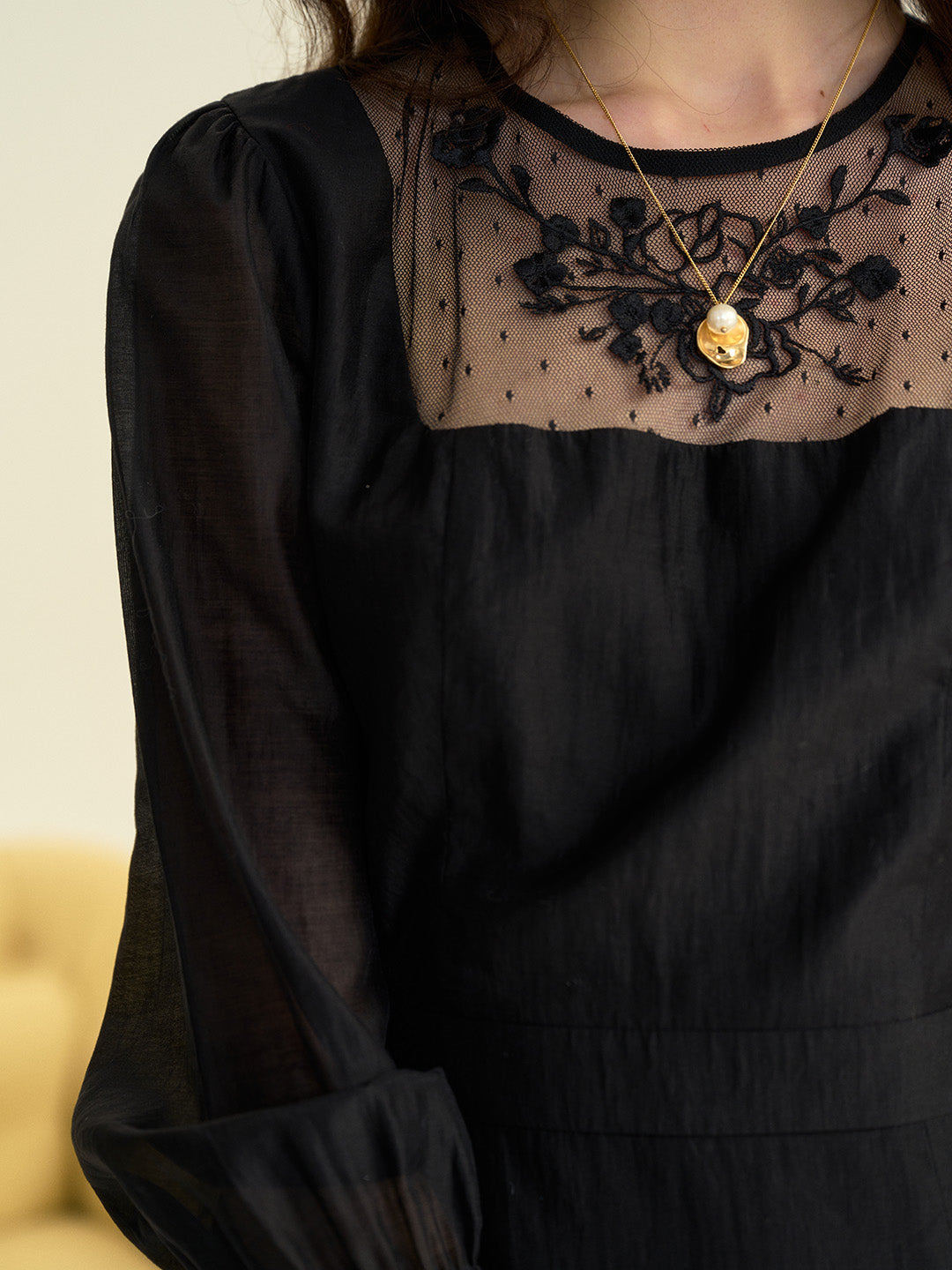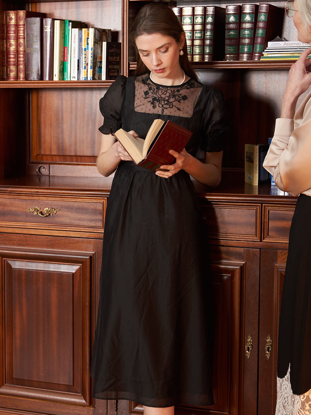 Ariella Round Neck Mesh Embroidered Puff Sleeve Dress