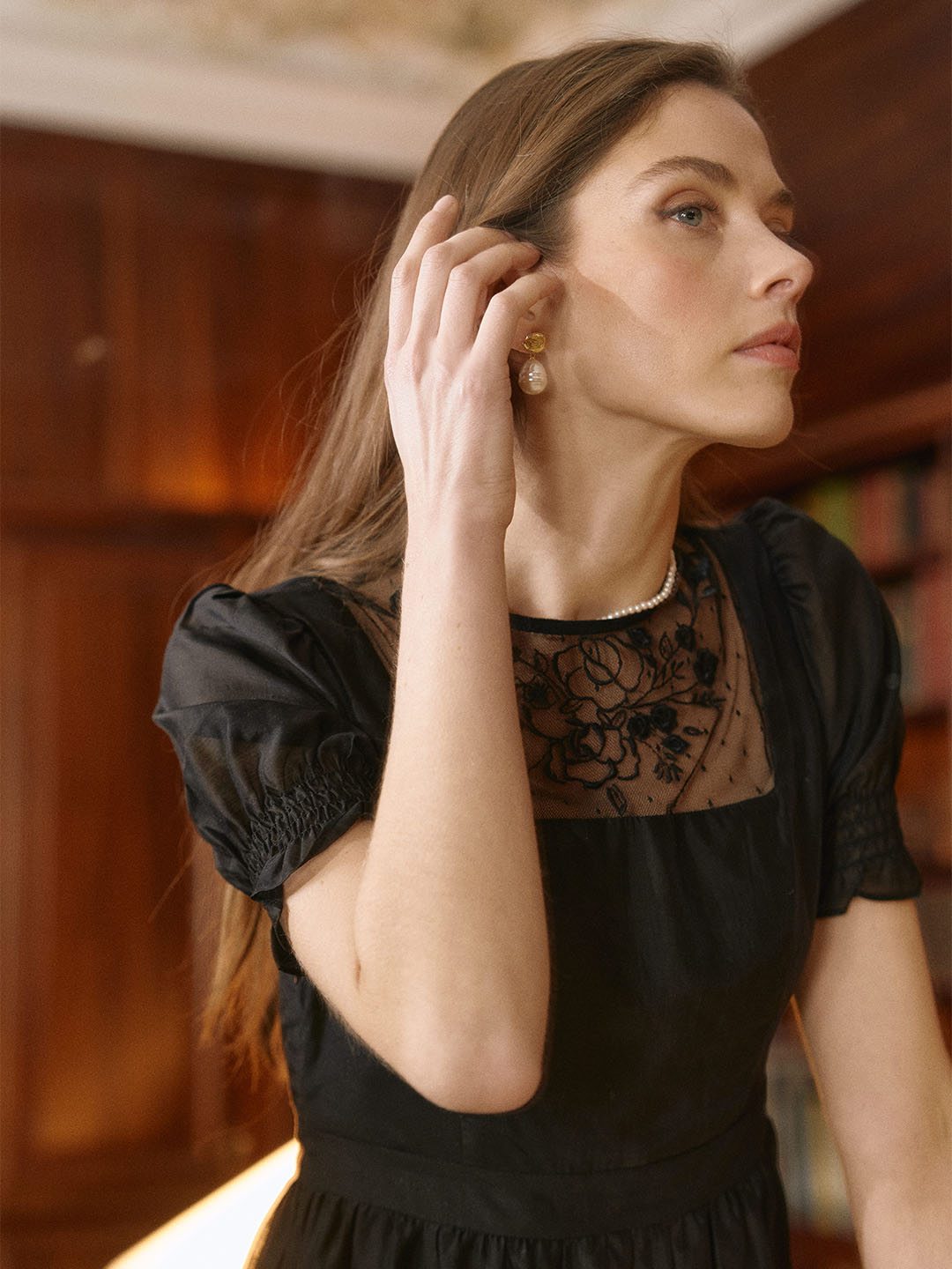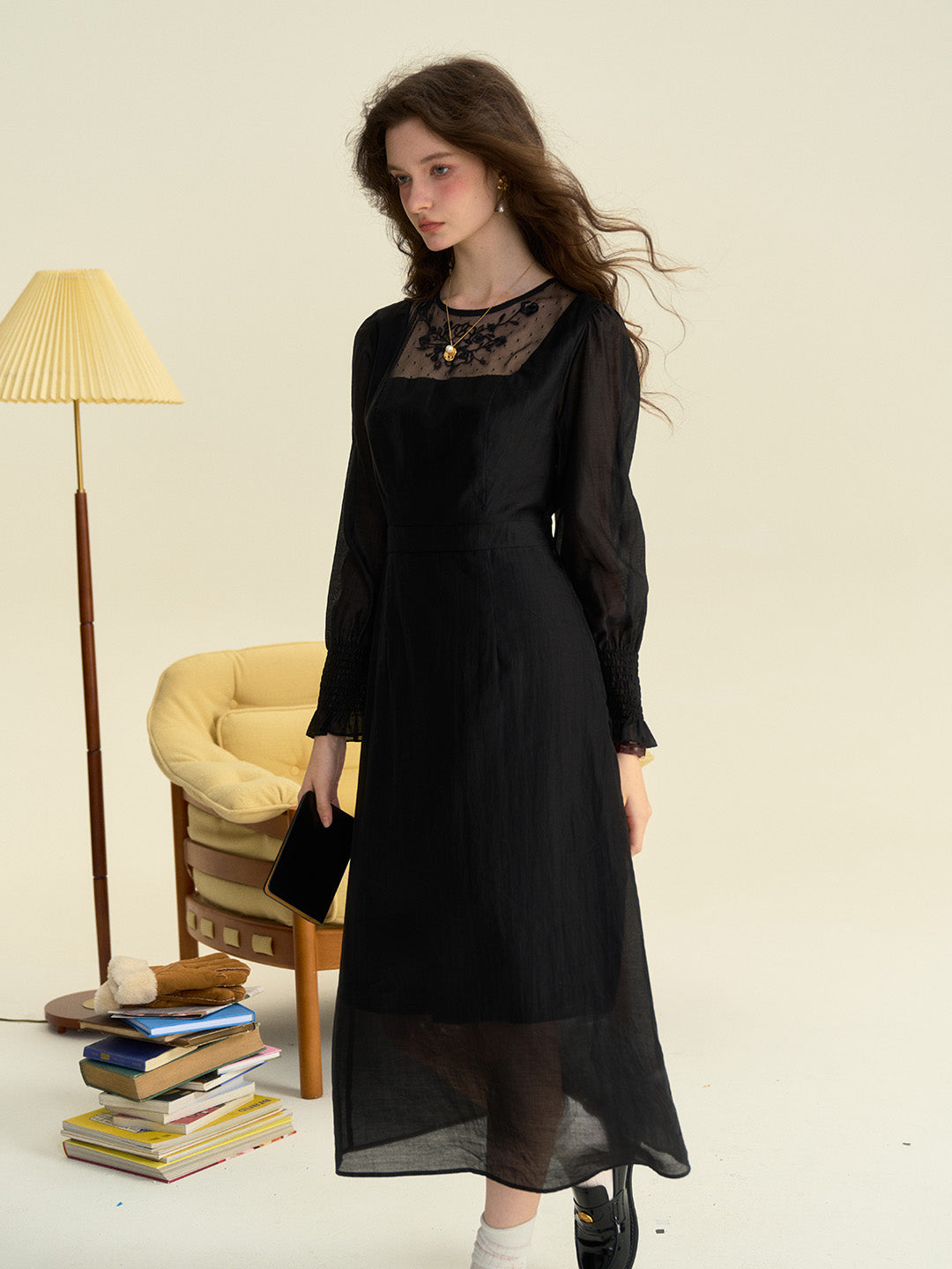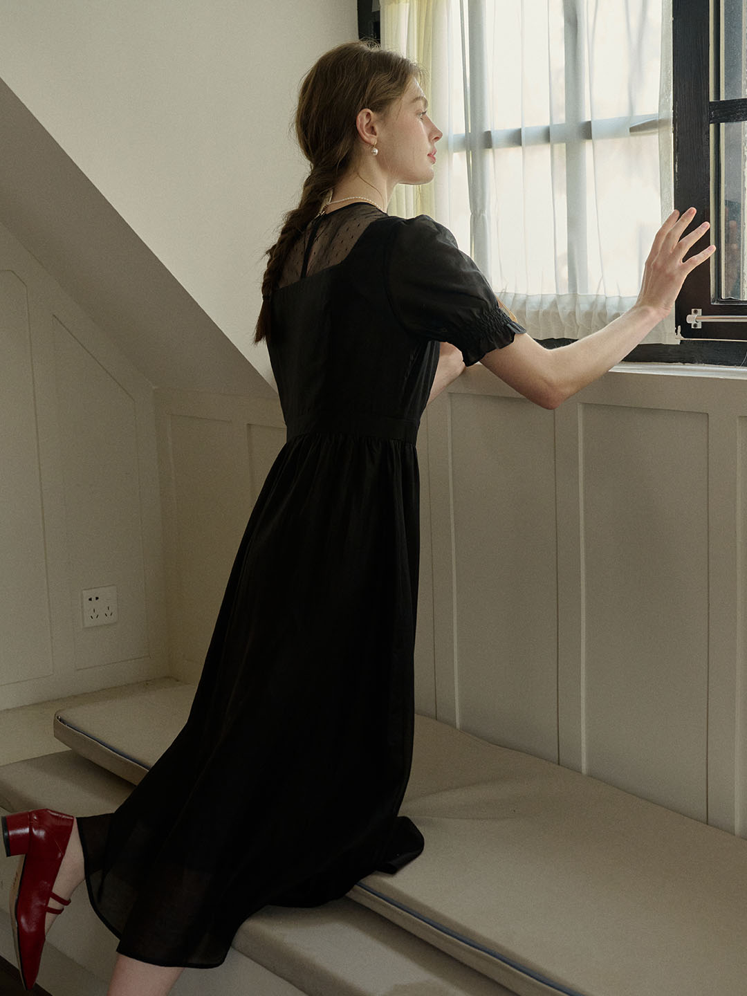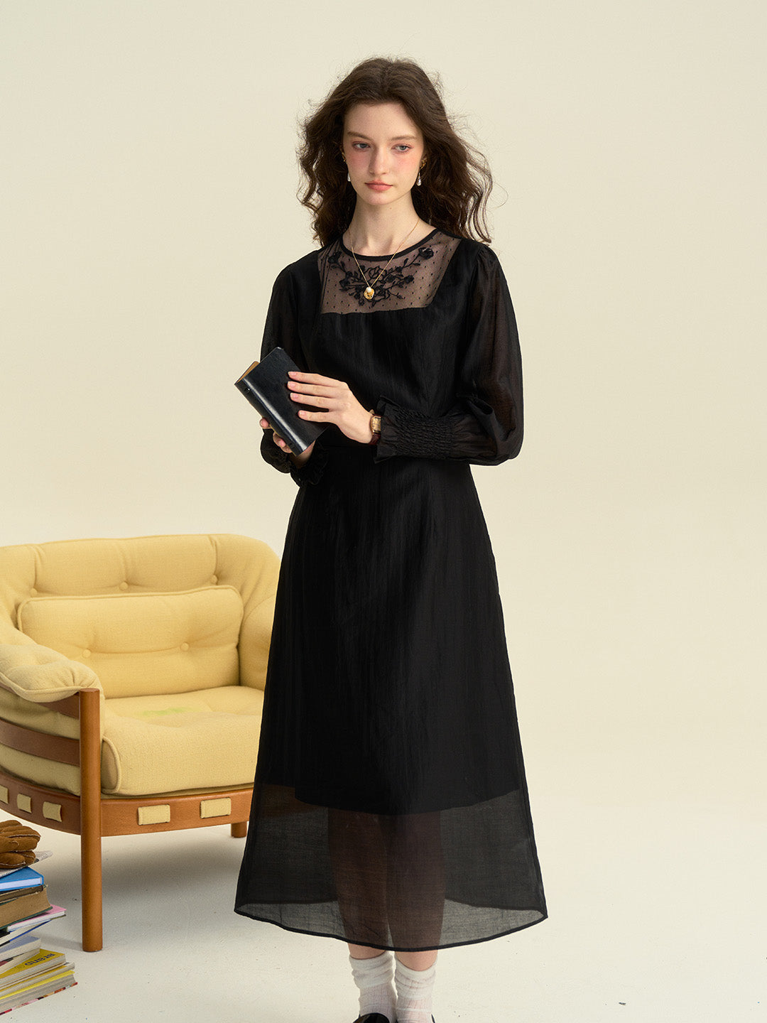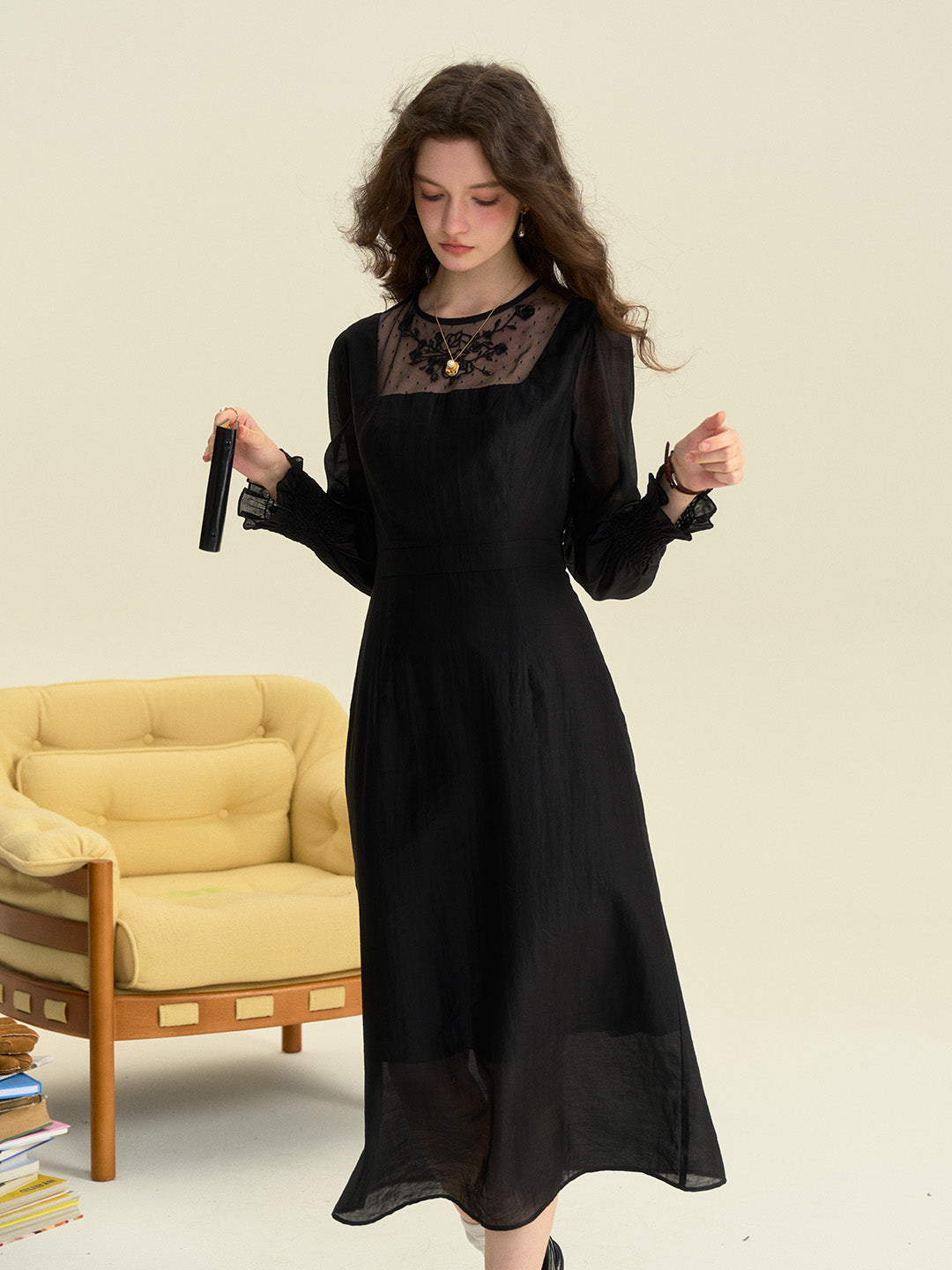 Ariella Round Neck Mesh Embroidered Puff Sleeve Dress