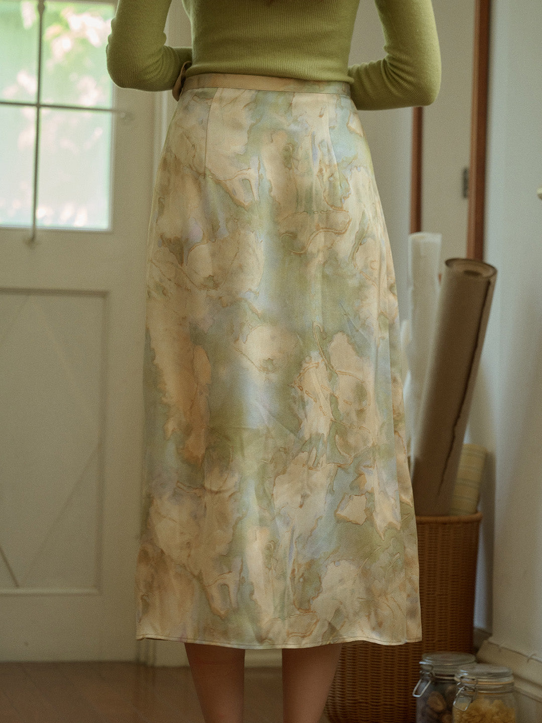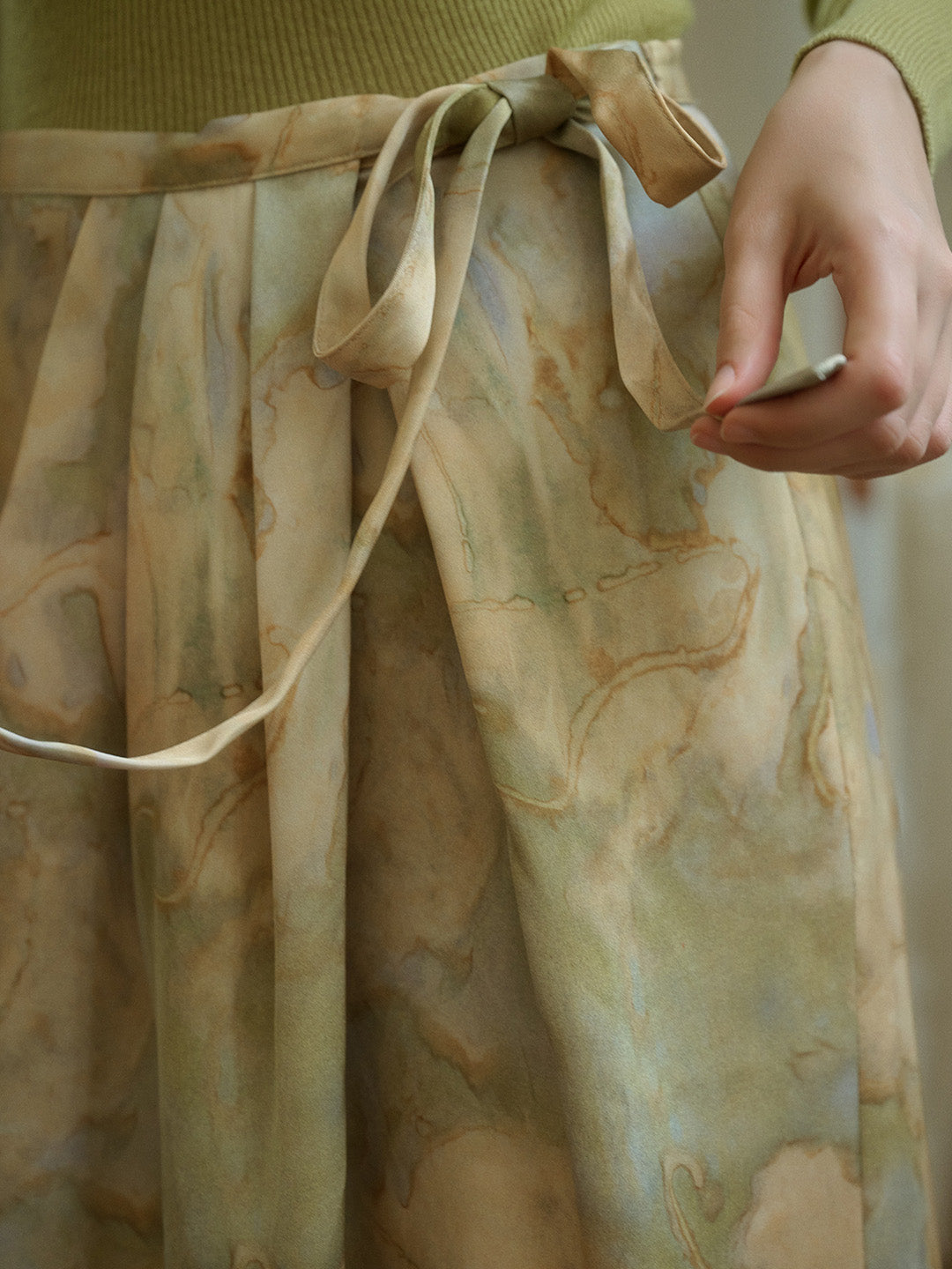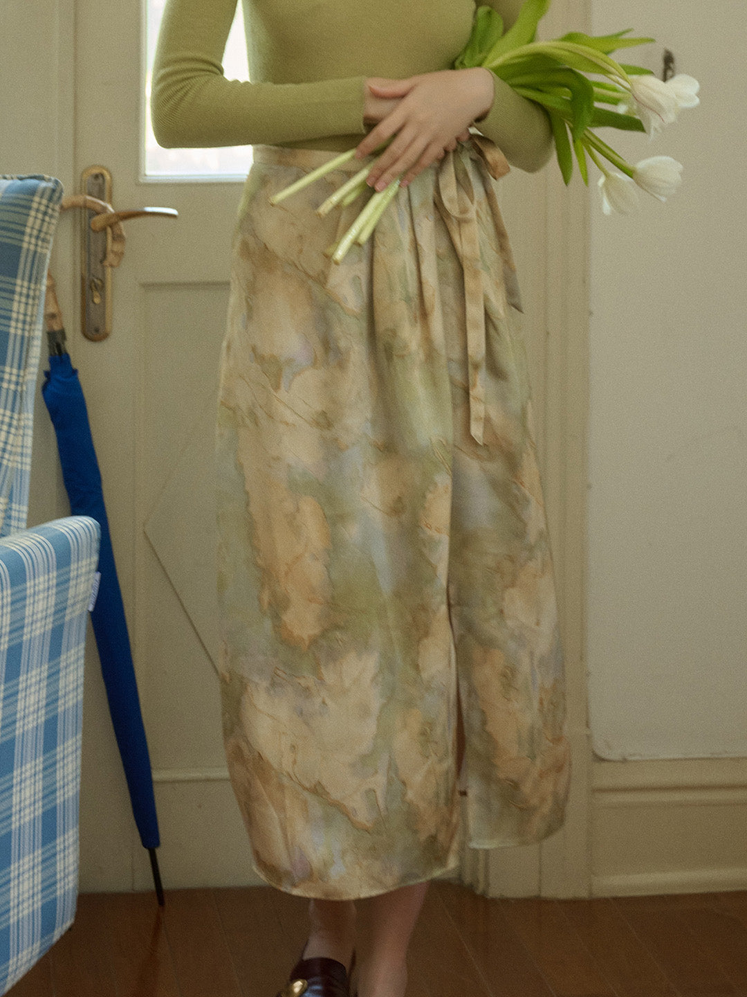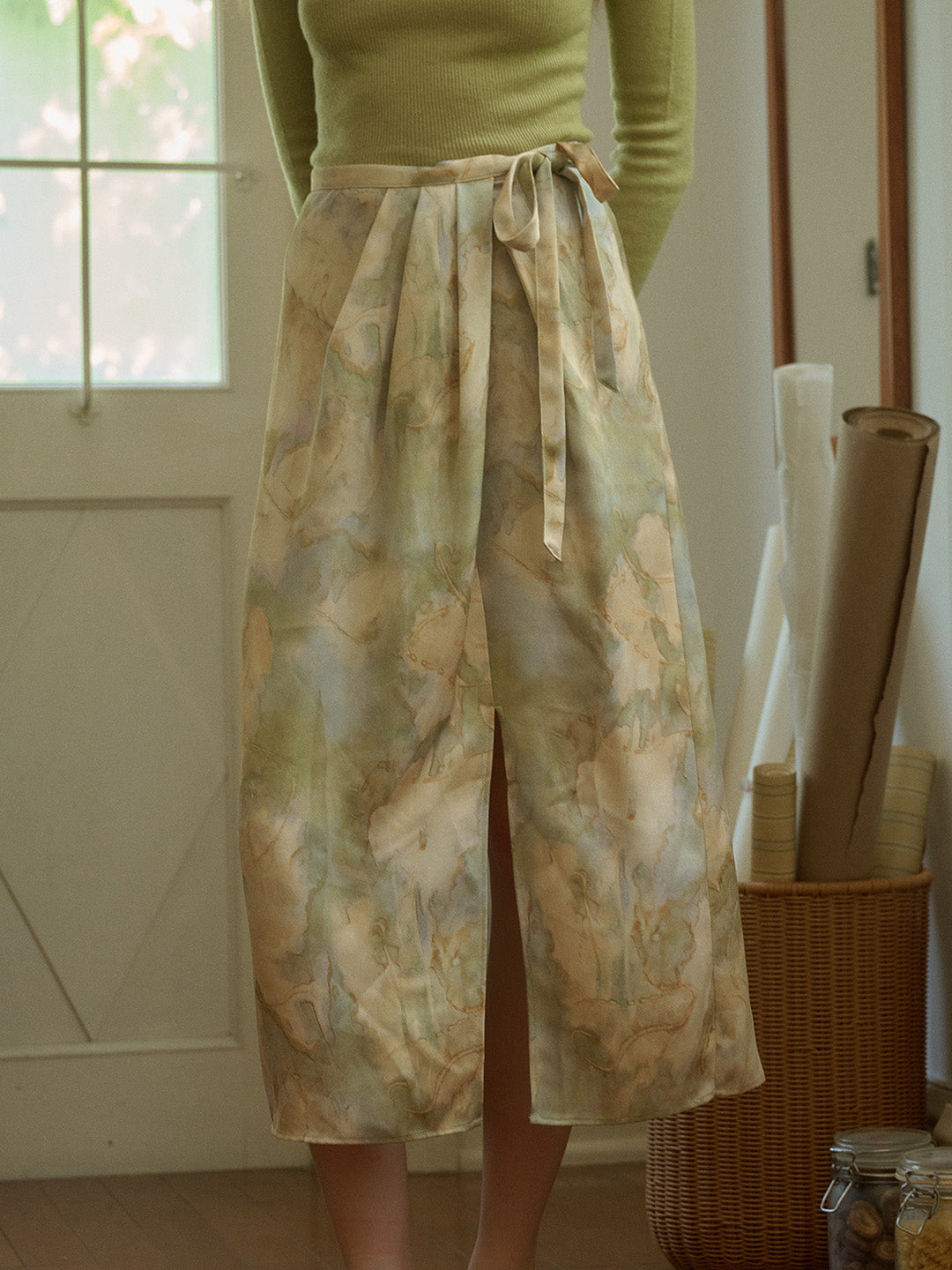 【Final Sale】Isabela Vintage Oil Painting Print Waist Tie Slit Satin Skirt