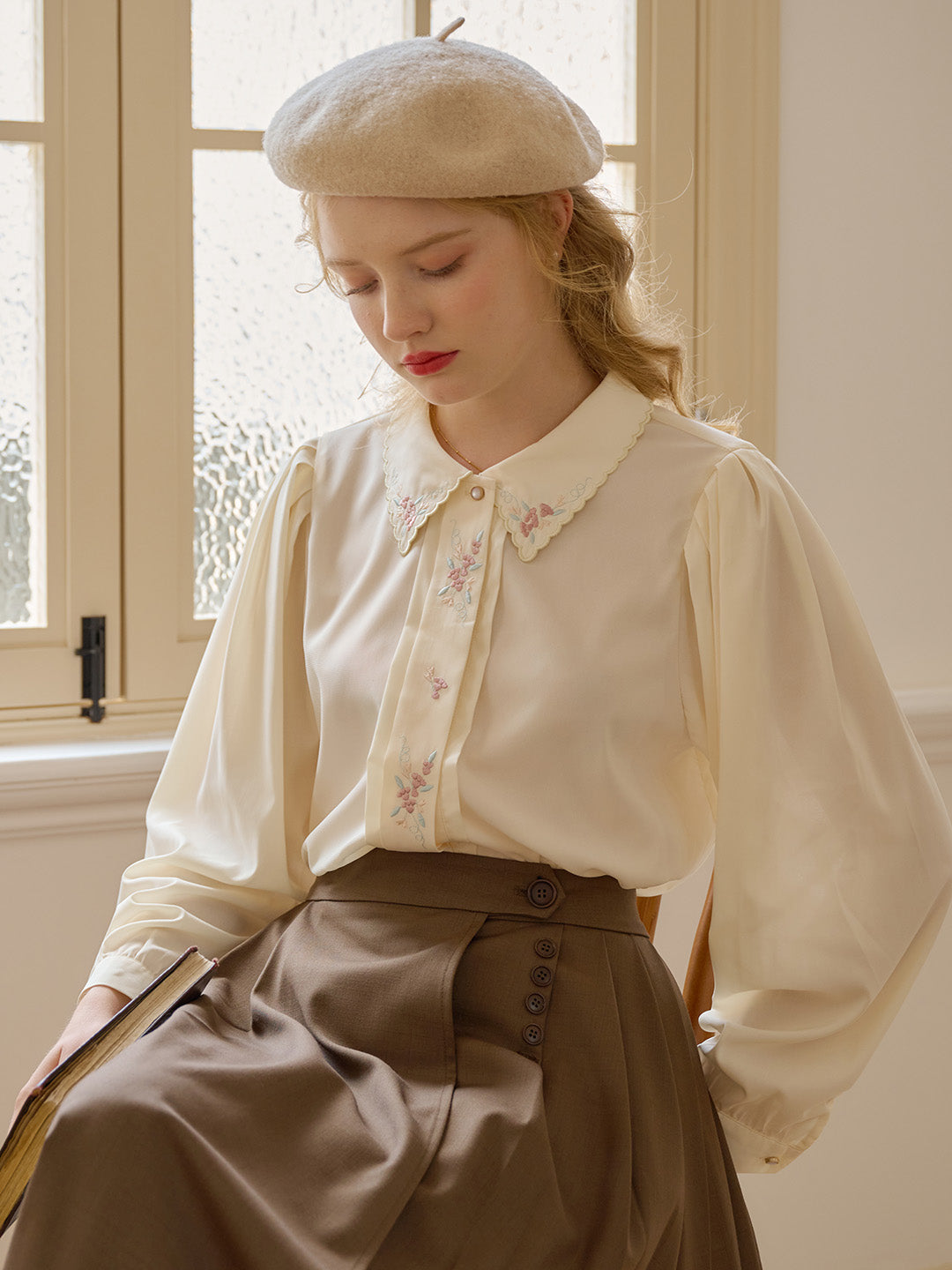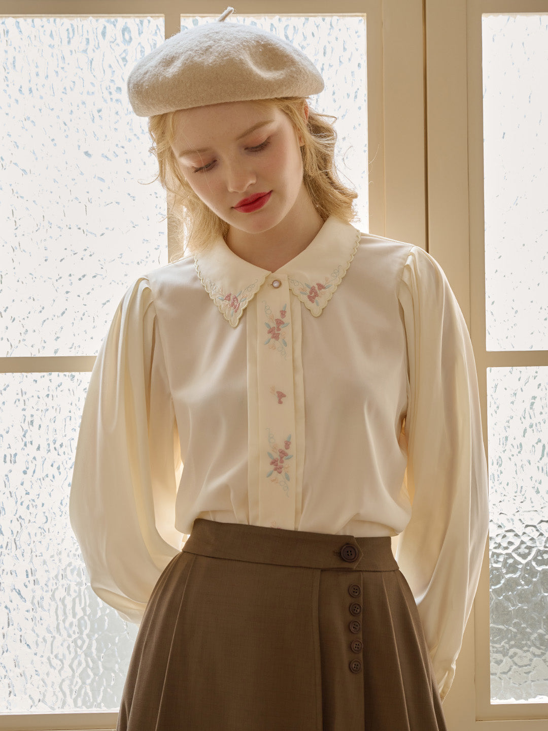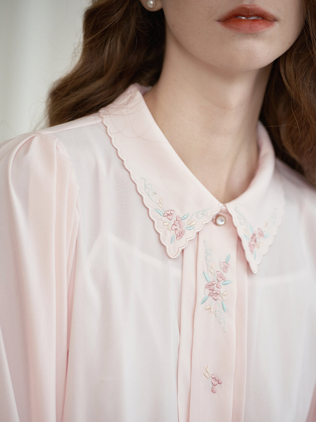 Detail | Color embroidery is integrated into the body, superimposed with a small amount of puff sleeves to improve the head-to-shoulder ratio; the small A-line loose version retains a comfortable space; the characteristic placket is pleated to add a sense of hierarchy; the preferred elastic chiffon fabric is soft to the touch and silky texture |