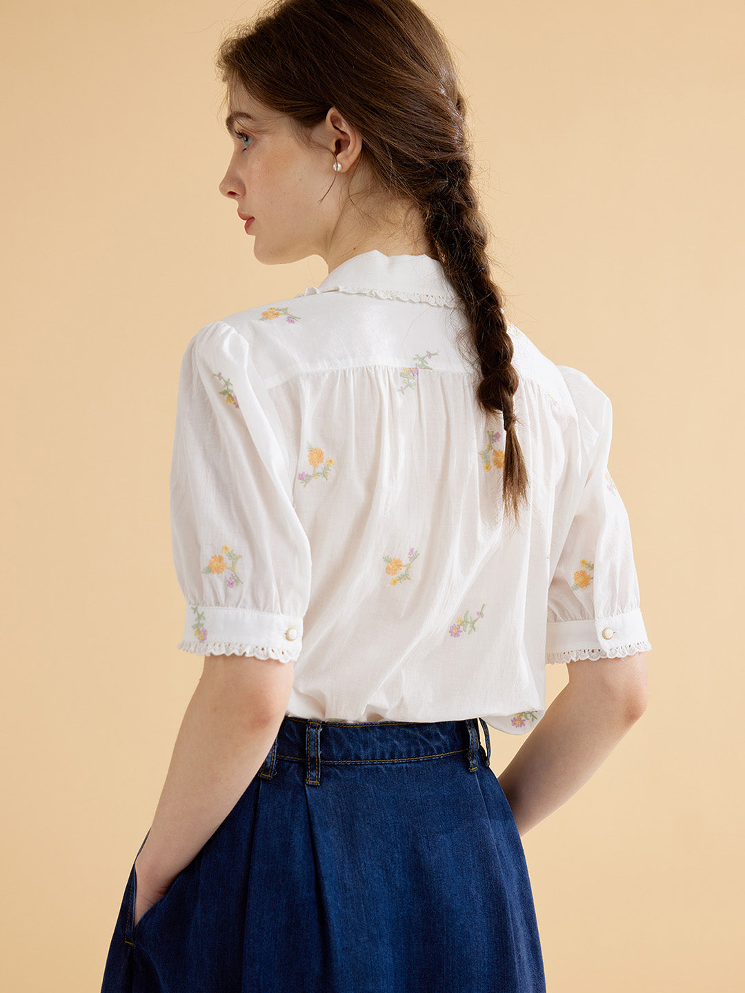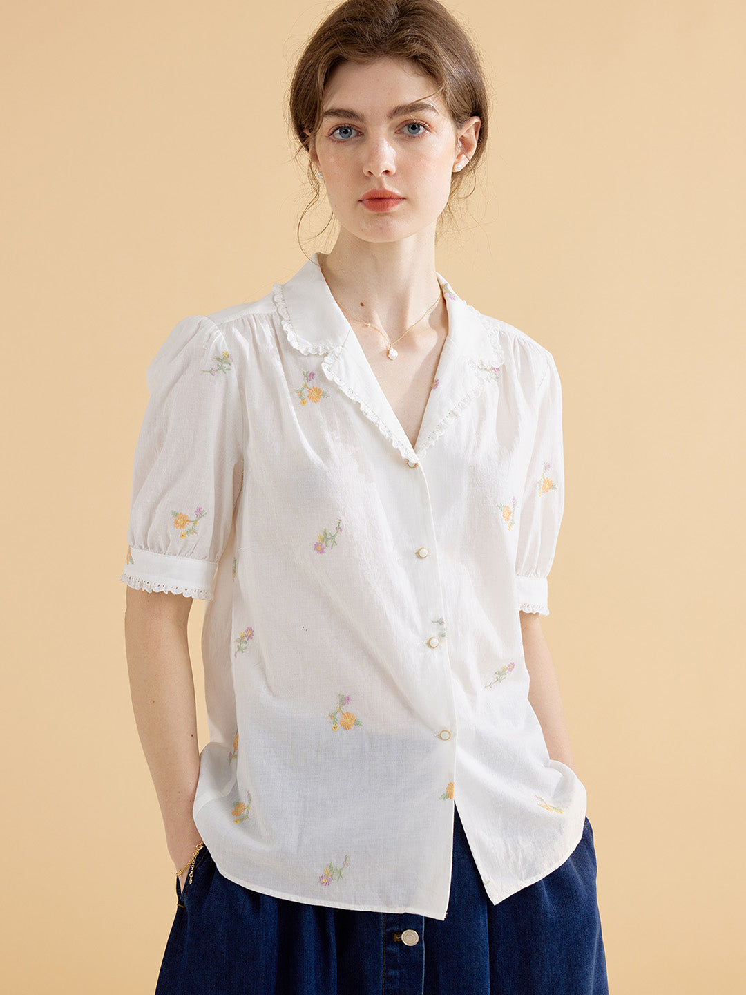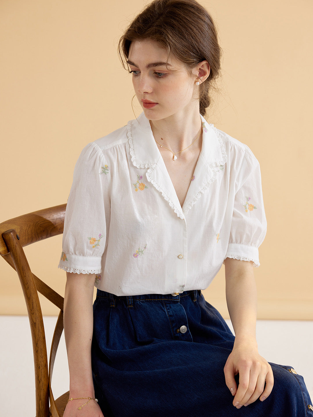 Marceline Simple V Neck Embroidered Cotton Shirt