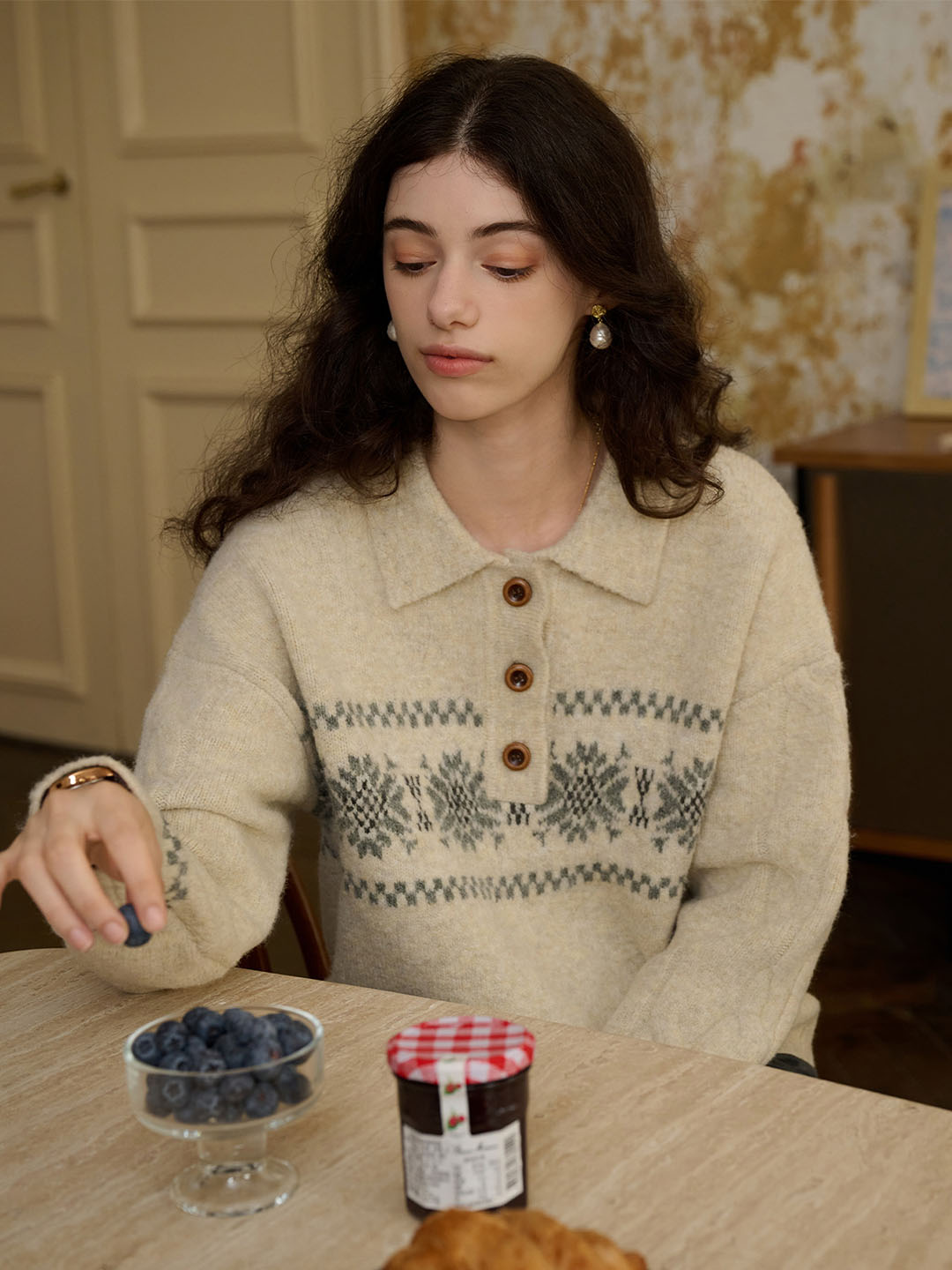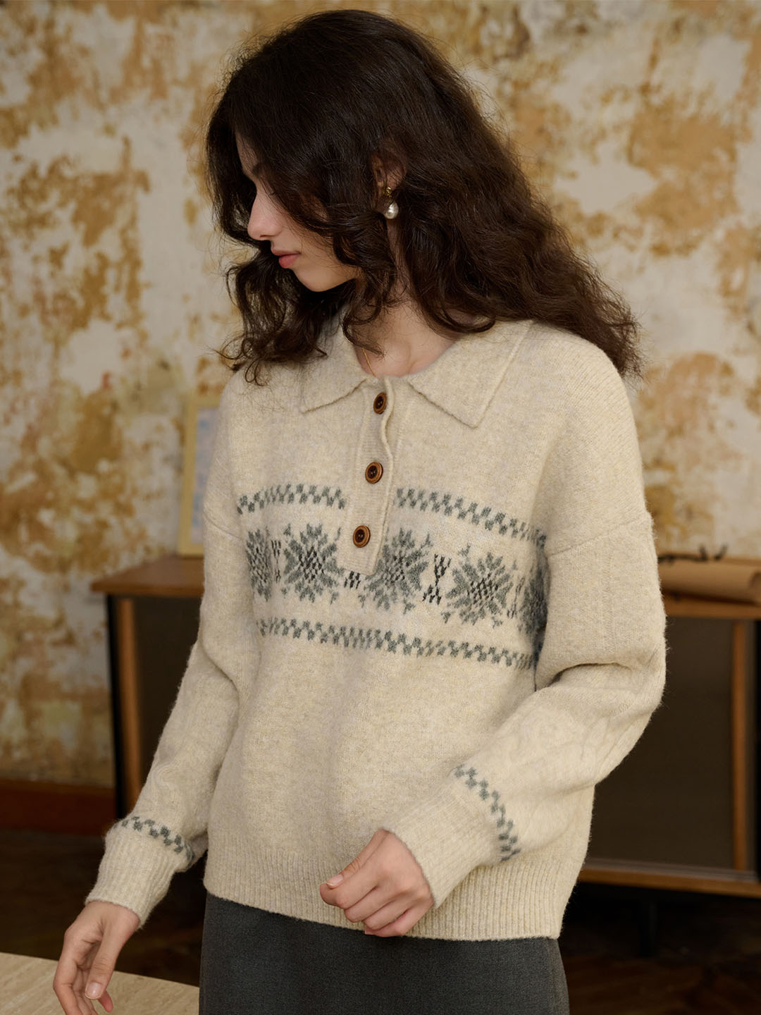 Norah Snowflake Jacquard Polo Fair Isle Knit Sweater-Grey