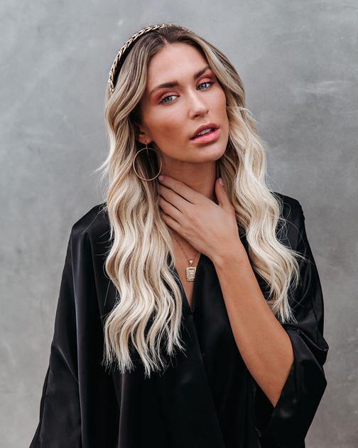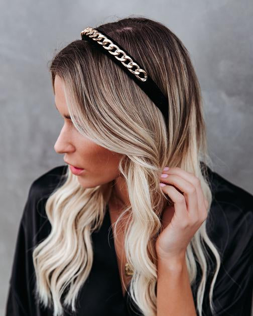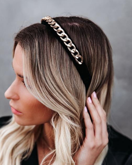 THIS ITEM IS FINAL SALE Length Approx. 5.5â Width Approx. 1â Structured Fit with Velvet Fabric Gold Chain Detailing Preppy vibes are high in the Yvette Gold Chain Velvet Headband! This black velvet headband has a gold chain detail and looks adorable paired with a sweater, denim, and tall boots. Styled with the Perfect Hoop Earrings, Twisted Chain Necklace, Initial Card Necklace, and Isnât She Lovely Satin Drape Blouse.  Need Additional Measurements? Ask A Stylist! Call Us At (844) 478-8424 During Our Business Hours 7:30AM - 4:30PM PST Monday