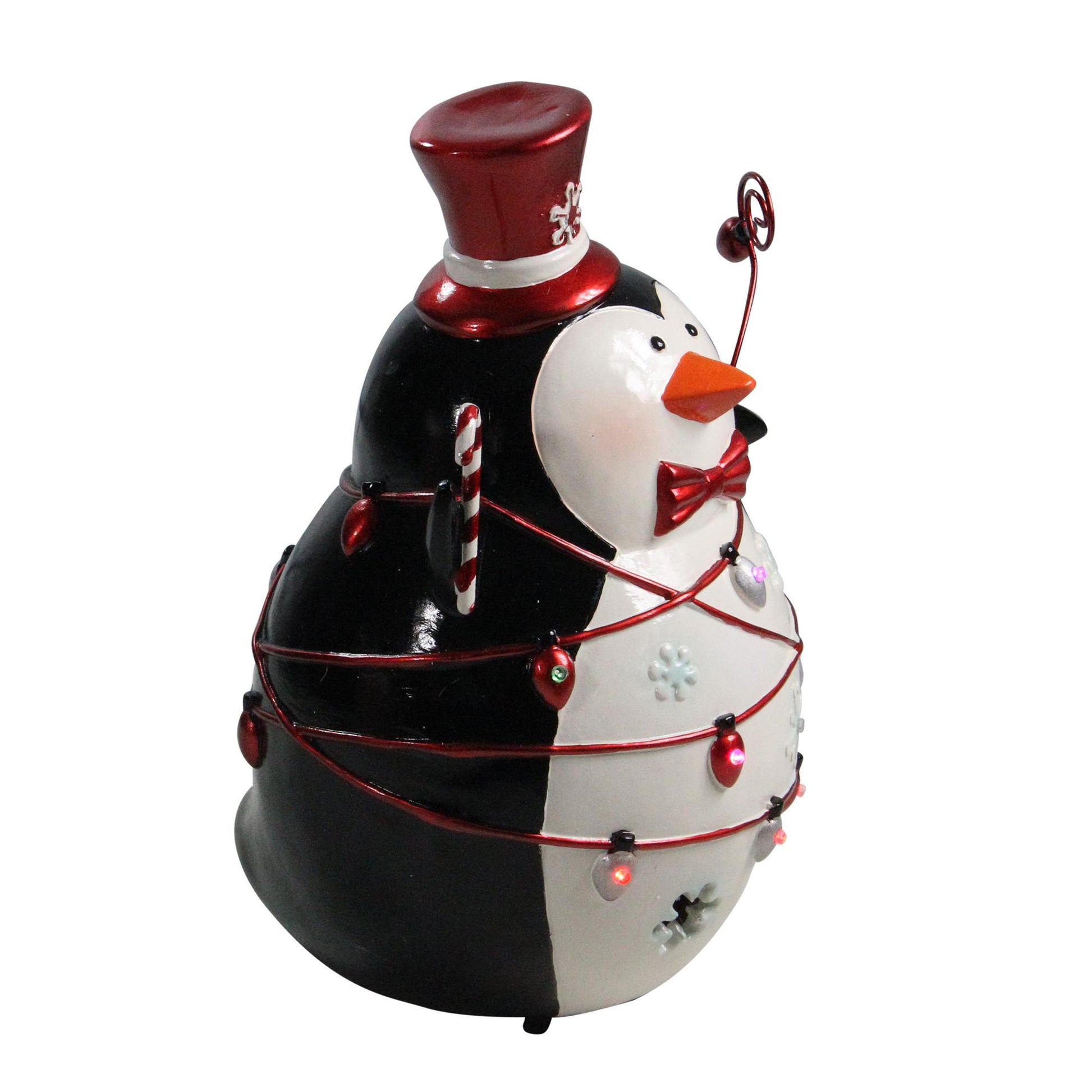 This adorable penguin seems to have gotten tangled in the Christmas lights! He's battery operated and shines with multi-colored LED lights. Your holiday guests will receive a delightful greeting from this playful penguin. Made from durable content, this decoration is perfect for indoors or outdoors. Product Features: Pre-lit black and white lighted string outdoor Christmas decor. Finished in metallic paint. Accented with red hat and candy cane. Additional Product Features: Pre-lit with (9) multi-colored LED lights. LED lights use 90% less energy . Multi-function switch located on battery pack . Durable non-glass non-replaceable bulbs. Cool to the touch . If one bulb burns out, the rest will stay lit. UL certified and approved for indoor use only. Requires 3 "AA" batteries - not included. Dimensions: 14" high. Material(s): fiberglass