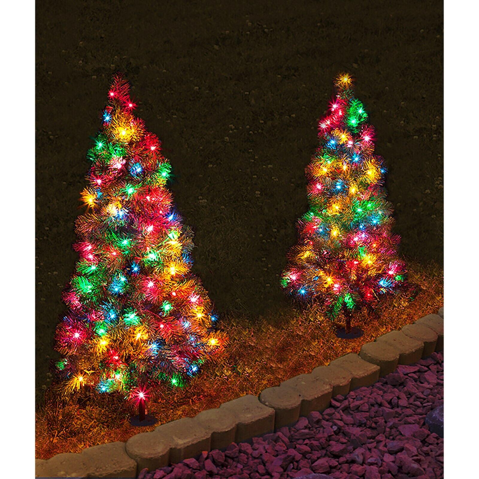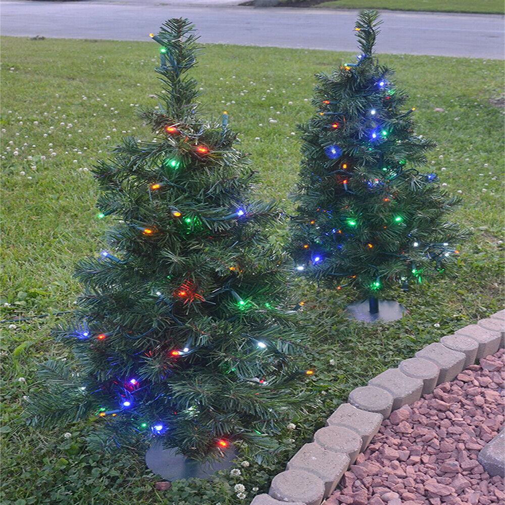 Set of 2, A/C Powered, 3 ft tall Pre-Lit Artificial Pathway Christmas Trees for Indoor/Outdoor use. Includes 70 Multi-colored led lights, steel ground stake and 3 point deck stand. If one bulb goes out the others stay lit. The 3 ft Christmas tree has 180 tips with bendable, natural looking branches. From tip to stand, we've specially ed these trees to handle the demands of Mother Nature. For starters, the branches are fabricated from heavy gauge wire ed to withstand wind and snow, and the needles are UV-coated to resist the fading effects of the sun. This tree is, without a doubt, among the nicest pathway trees available on the market today.