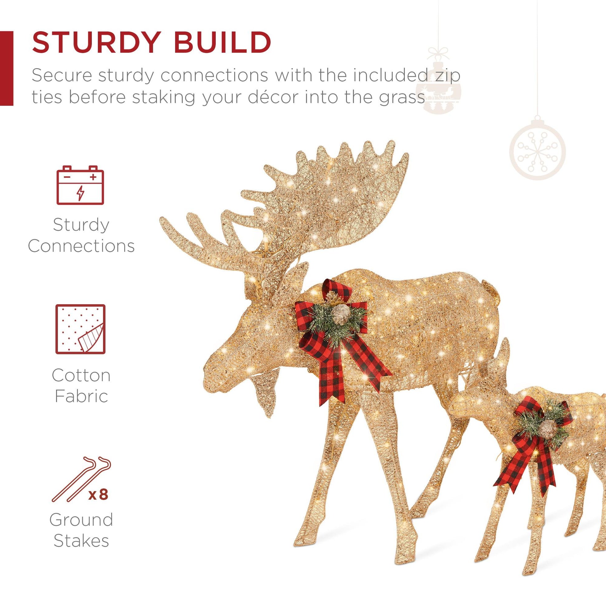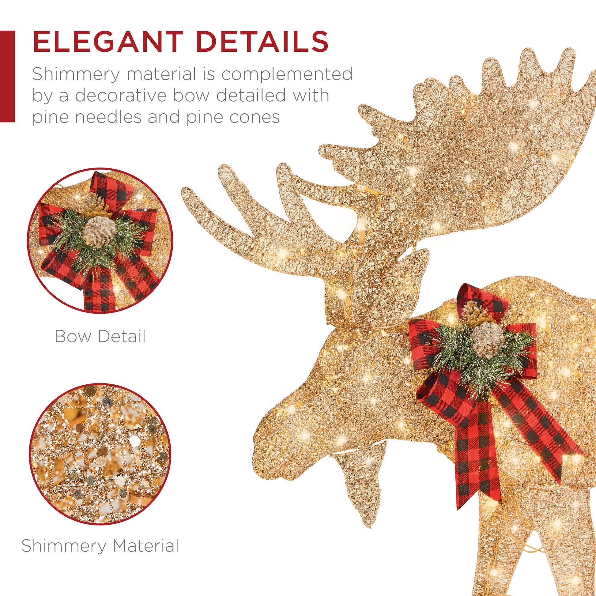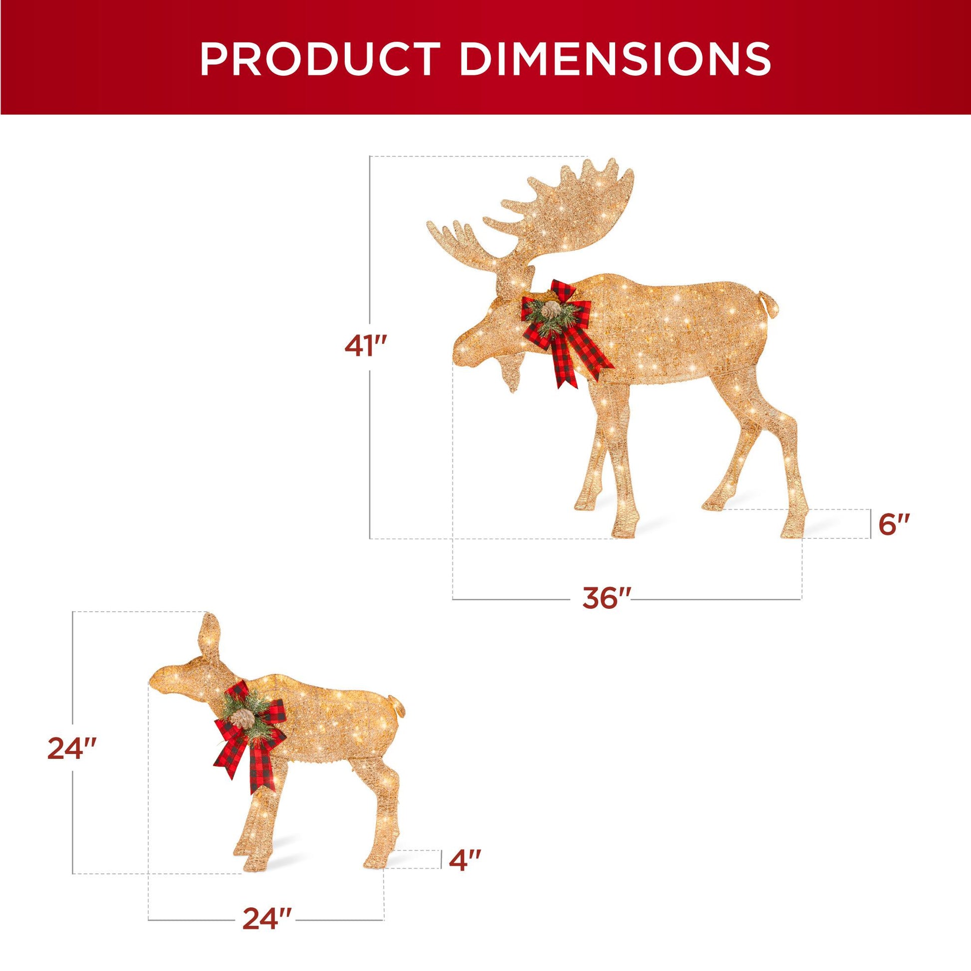 This 2-piece set is the perfect accent to bring life to your yard. With a wholesome scene of sparkling bull and its baby calf, you'll create a scene you and your neighbors can enjoy. This moose family lights up with 170 warm white LED lights, powered by 2-prong power chords; they're cool to the touch for safety, and environmentally friendly as well. Plus, a sturdy build is easily achieved. Simply secure the sturdy connections with the included zip ties before staking your decor into the grass. Crafted with all-weather cotton fabric plus included ground stakes, you can keep your decor damage-in winter months with durable material that withstands the elements; that means this set is rain-resistant, snow-resistant, and wind-resistant! To emphasize this set's elegant details, its shimmery material is complemented by a decorative bow detailed with pine needles and pine cones. Holiday spirit shines through in decorations just like this! For placement purposes, the product dimensions for the bull moose are 36" x 6" x 41" (LxWxH) while the calf measures at 24" x 4" x 24" (LxWxH).