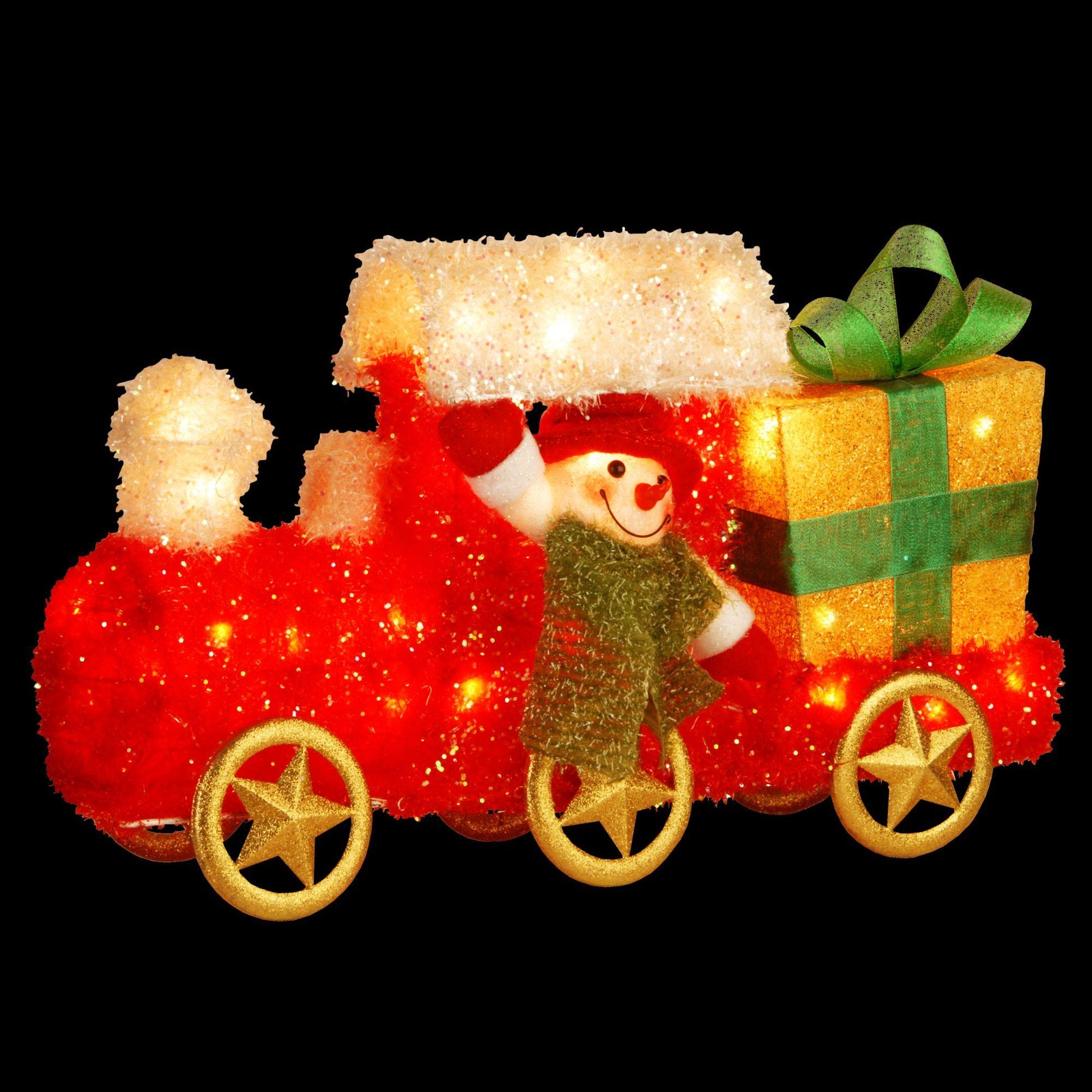 When it is exactly time to shout out the joy of the season, have this tinsel train with gift and snowman and clear outdoor lights inside them to announce the same. Fix it in your outdoors to see a bright welcoming note this decor piece set. Those 35 clear lights inside are sure to keep your garden area glittery all night long. Features: Features Snowman on train with glitter accents. Pre-lit with 35 UL listed clear lights. Light color: clear. Light type: mini. Recommended for indoor/outdoor decorative use. Dimensions: 23" high. Material(s): tinsel