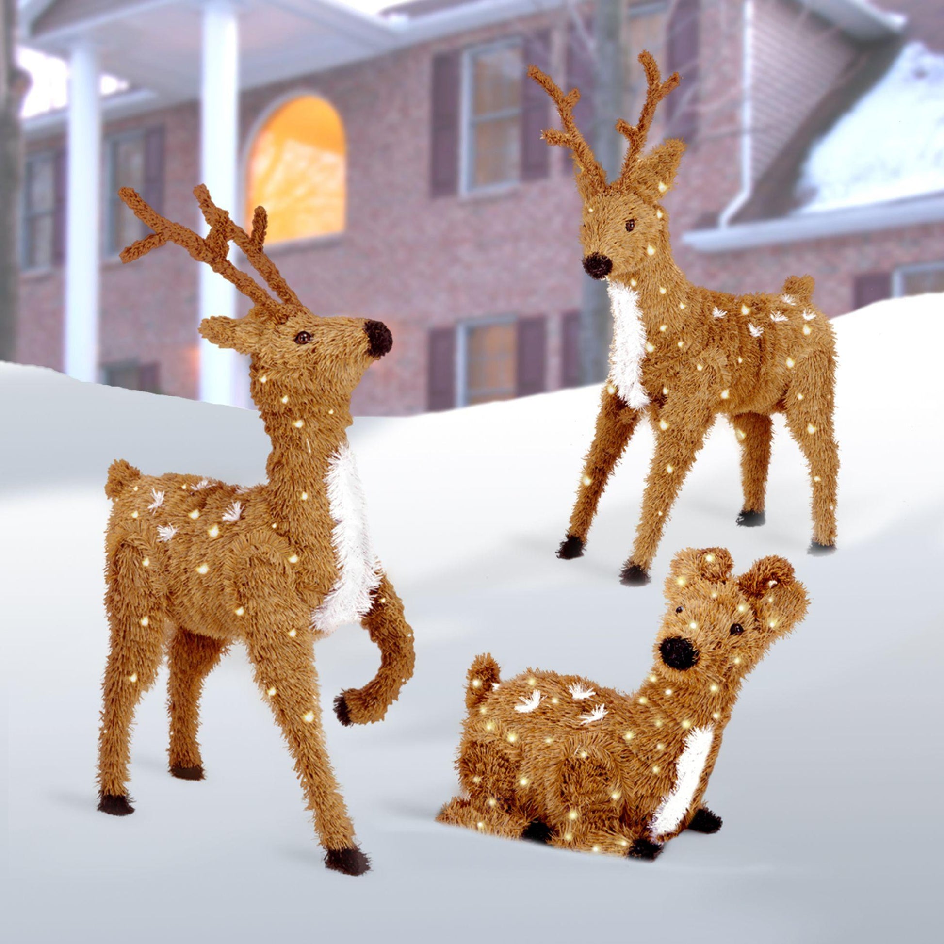 This cute and adorable reindeer with clear lights will definitely add an exciting finish to your home decor. It features pre-strung with 100 clear lights that remain lit even if a bulb burns out. This resting reindeer is taking a break from a long night's journey but will provide many years of holiday joy. Features: Pre-strung with 100 UL listed clear lights. Colors/finish: Brown and White . Display on doors, walls and windows. Recommended for indoor use. Dimensions: 24 inches tall x 8 inches wide x 21 inches deep. Material(s): Plastic