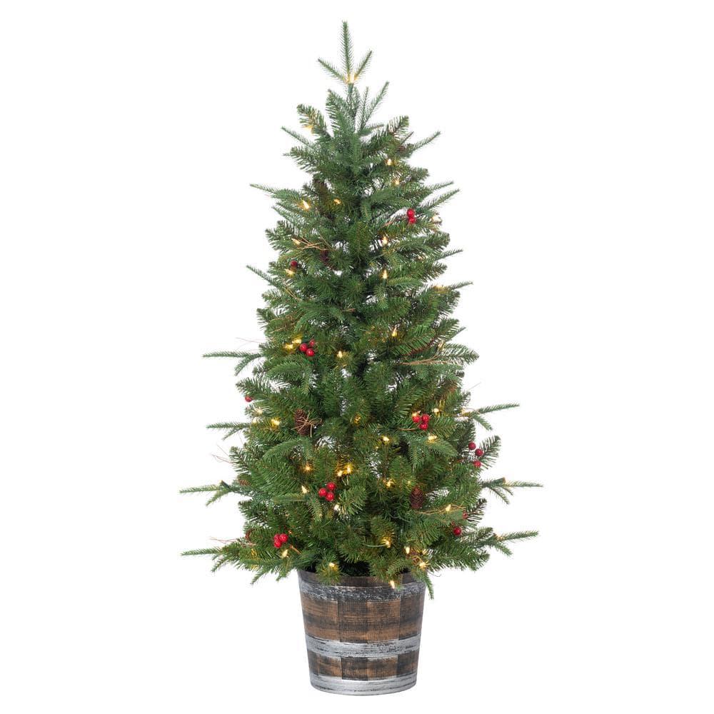 A combination of rustic and classy, our beautiful pre-lit potted Natural Cut Hudson Pine is perfect accent tree for your porch in indoor decor scene. This stunning tree stands 4 ft. high and measures 26 in. at base, giving a soft holiday glow with 100 pre-strung warm white lights. Pine cones and berries are scattered though it's 406 branch tips that allow plenty of room for your treasured decorations. This tree rests in a gorgeous decorative barrel-styled pot for stability while adding a hint of elegance to your holiday decor. This lovely tree and its pine needles are fire resistant for your safety.