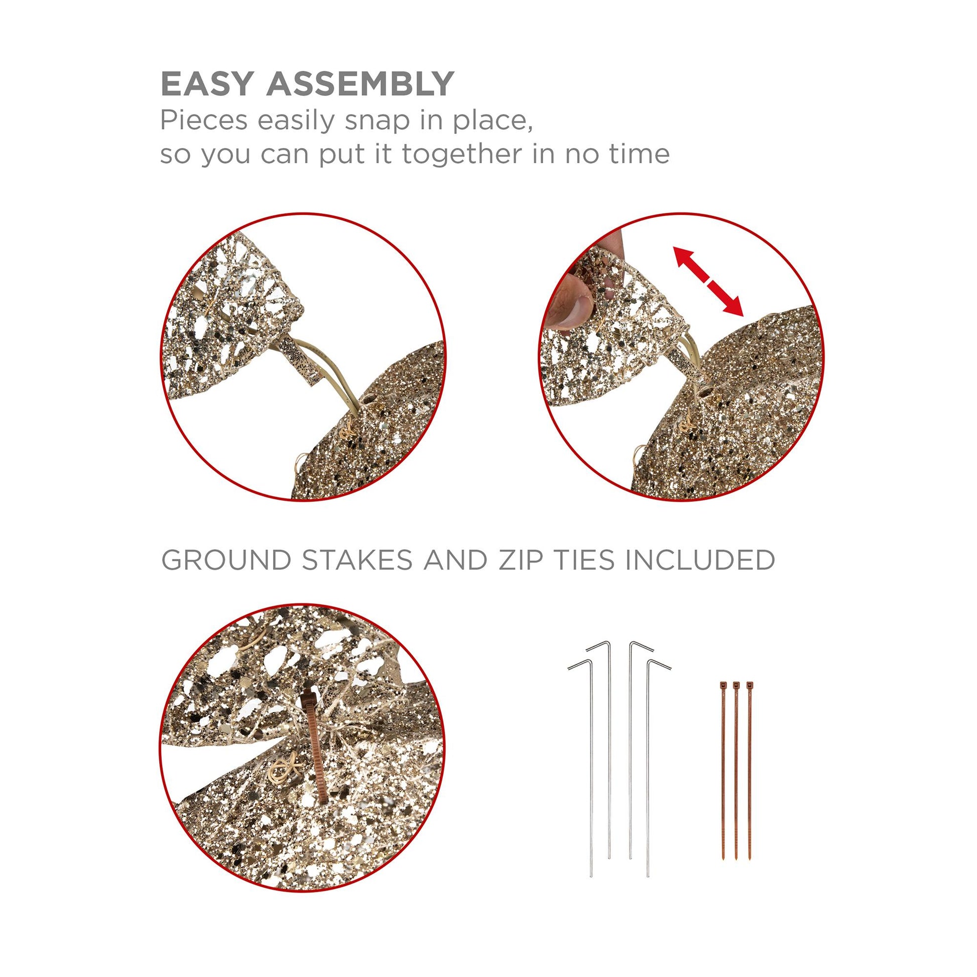 Santa's favorite reindeer is making its way to your front yard! The glittery-gold, 3D of our Pre-lit Christmas Reindeer brings an element of elegance to your decorative setup that's hard to match. This product features an easy assembly; the pieces easily snap in place, so you can put it together in no time (ground stakes and zip ties included) It's just one click away from being yours!