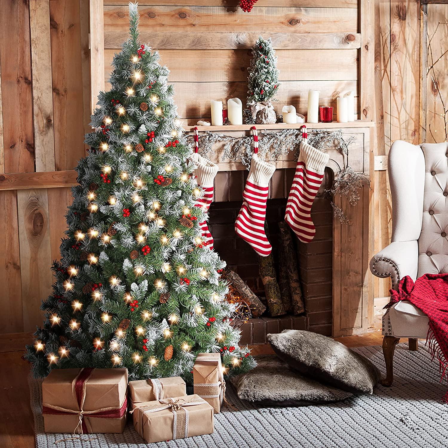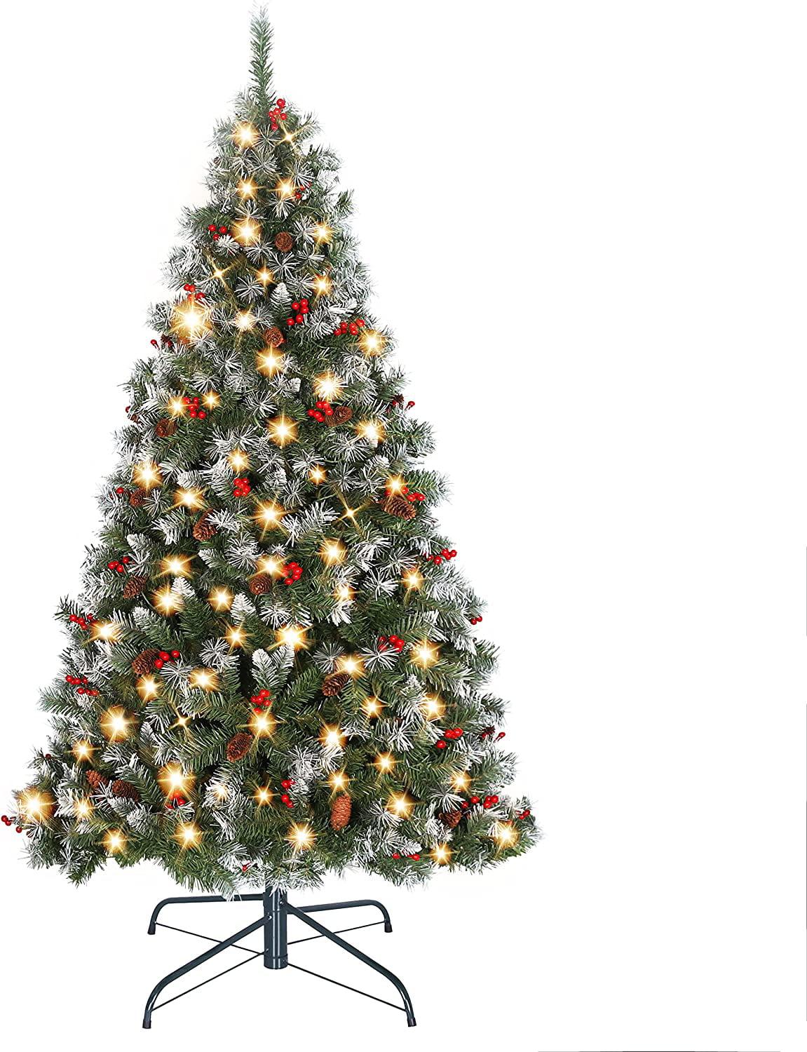 - Pre Strung Lights - The snow covered branch tip christmas tree has pre-strung lights that lit your luminous family party with warm white lights. Save time to set up lights string you only need to plug in to make bulb emit wonderful soft glow all night long. Green color tree with red berries and brown cones show your vigour and vitality in cold winter.