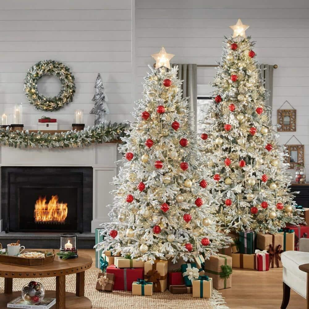 - Flocked branches create a snowy setting