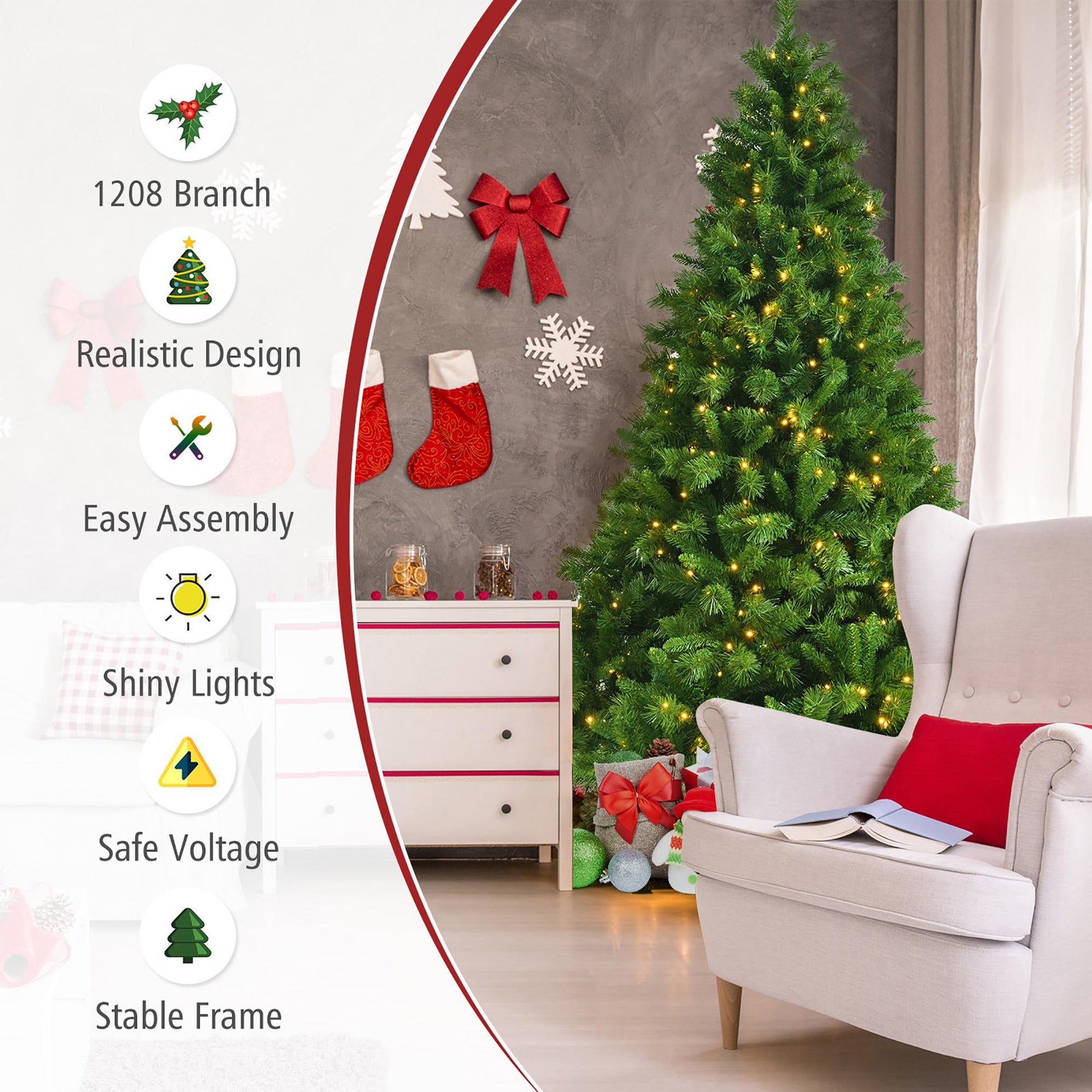 - Realistic with Plentiful Leaves: The Christmas tree is built-in PVC green leaves, to show you a lifelike decoration for long-term indoor use. This 7ft Christmas tree comes with 1208 branch tips that of various leaf shapes showcases a lush look and creates natural gradation, adding unique festive atmosphere in the holiday.
