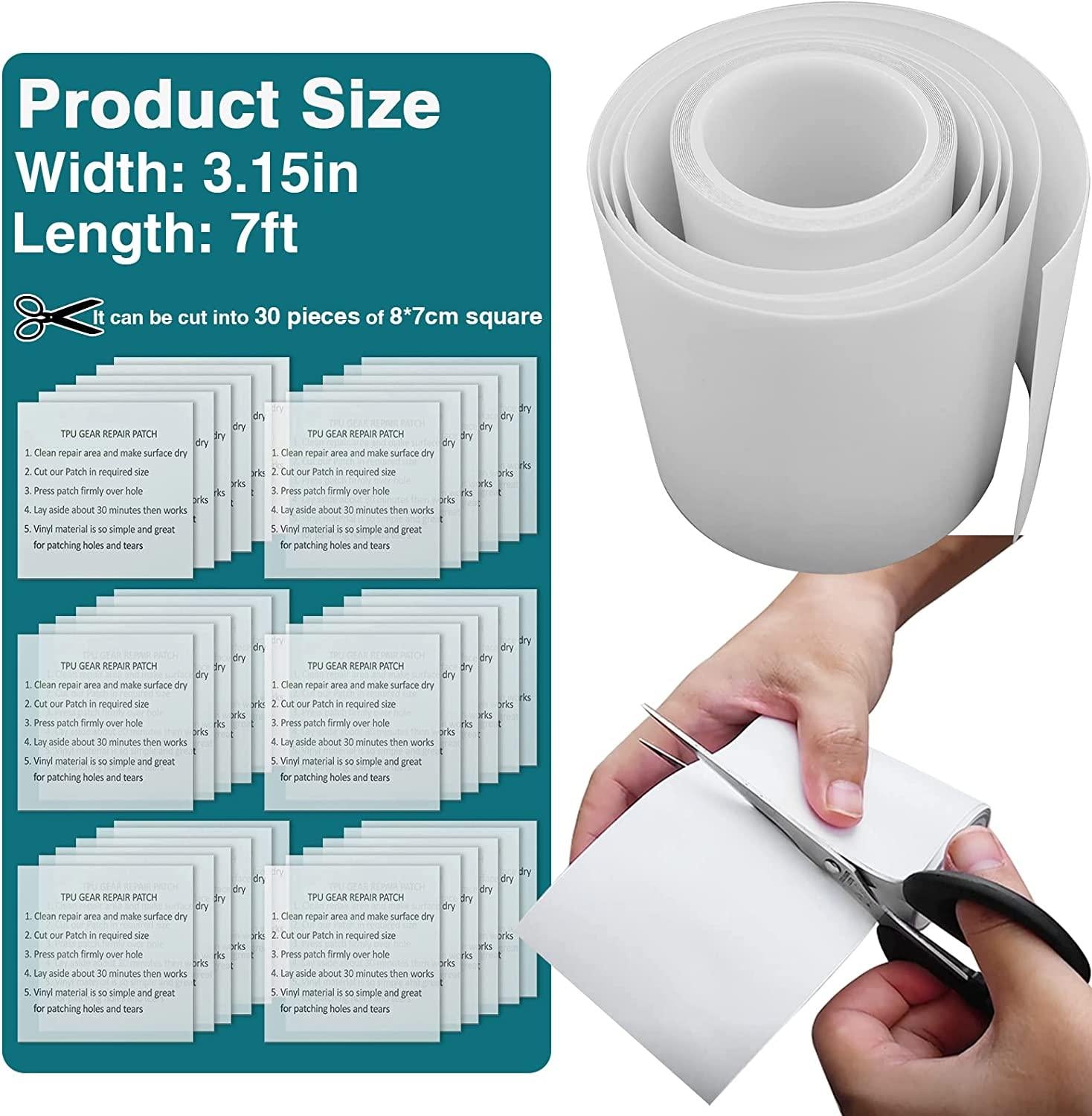 - [Perfectly Repair]: 3.15 in x 7 ft roll patch can repair larger and longer holes, and can also be cut ly to repair small holes. Itâs a very flexible size! It can work perfectly even in the hot summer. Perfectly repair the puncture and leakage of the air mattress, bounce house, swimming Pool, tent, canvas, canopy, pool floats, tubes air bed and inflatable toys, save your inflatables, save money and time
