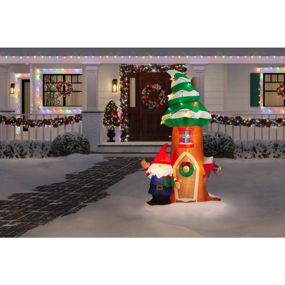Greet your guests with this 8-foot Airblown gnome house Christmas inflatable. Included stakes and tethers ensure this inflatable stands its ground throughout festivities, while lighted Christmas tree offers a focal point in your space. LEDs light up your holiday nights, and self-inflated offers setup for outdoor fun. This Airblown gnome house Christmas inflatable plugs in for dependable power and deflates for easy storage.