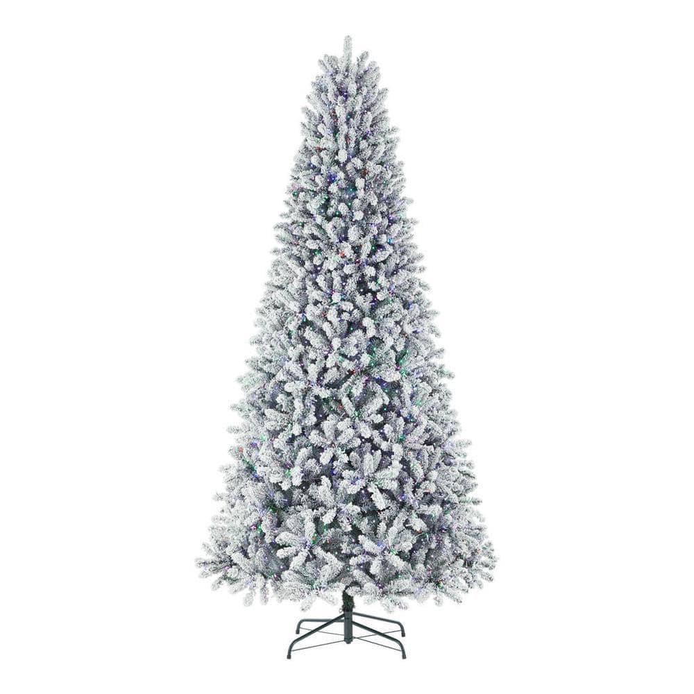 Hail holiday season with this 9-foot Fraser flocked fir pre-lit artificial Christmas tree. A set of 3,000 color-changing lights dazzle your seasonal display, while memory wire branch tips curve and bend easily to better hold ornaments. included remote control with 10 functions offers a fail-safe way to bring holiday spirit to any gathering space. This Fraser flocked fir pre-lit artificial Christmas tree features continuous-on technology, ensuring your display stays lit throughout season.