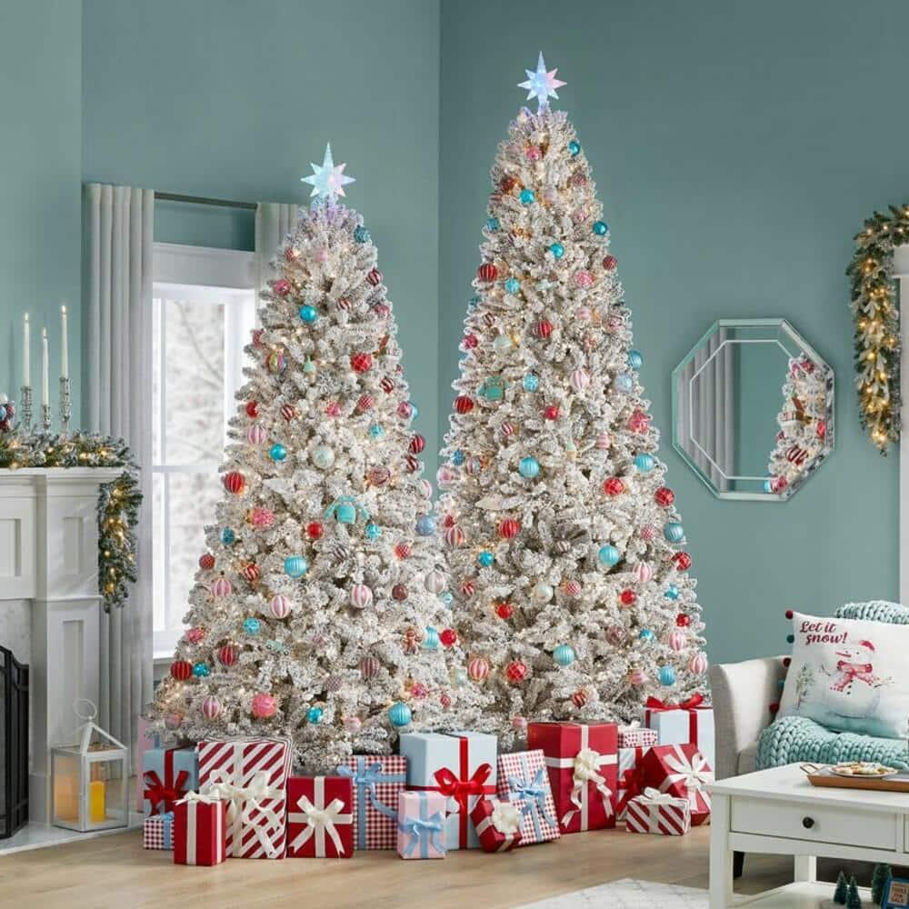 - Flocked tree mimics a white Christmas